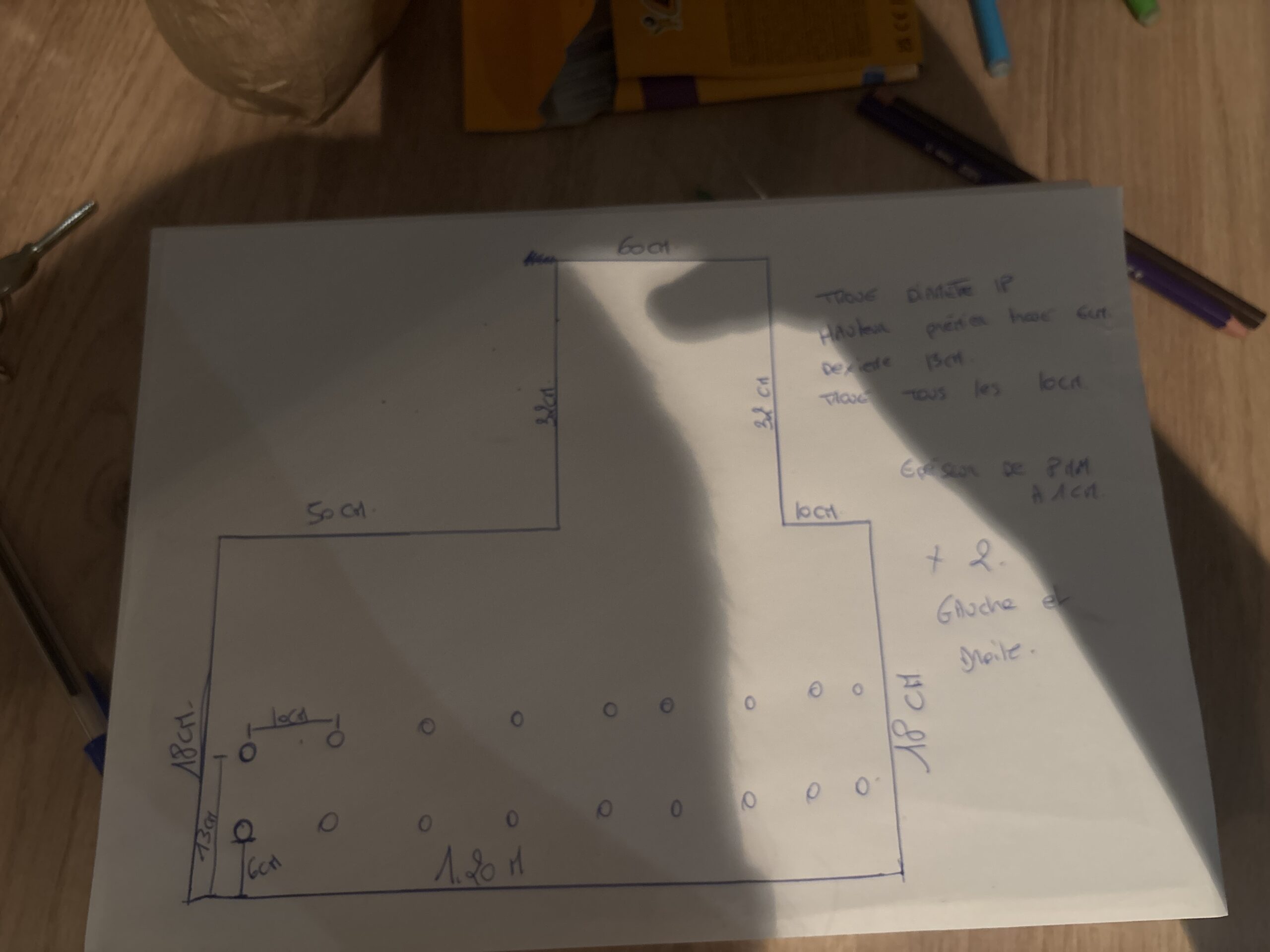 Avec des trous, diamètre 18 tous les 10 cm premiers trous à 6 cm du bas et le deuxième à 13 cm du bas