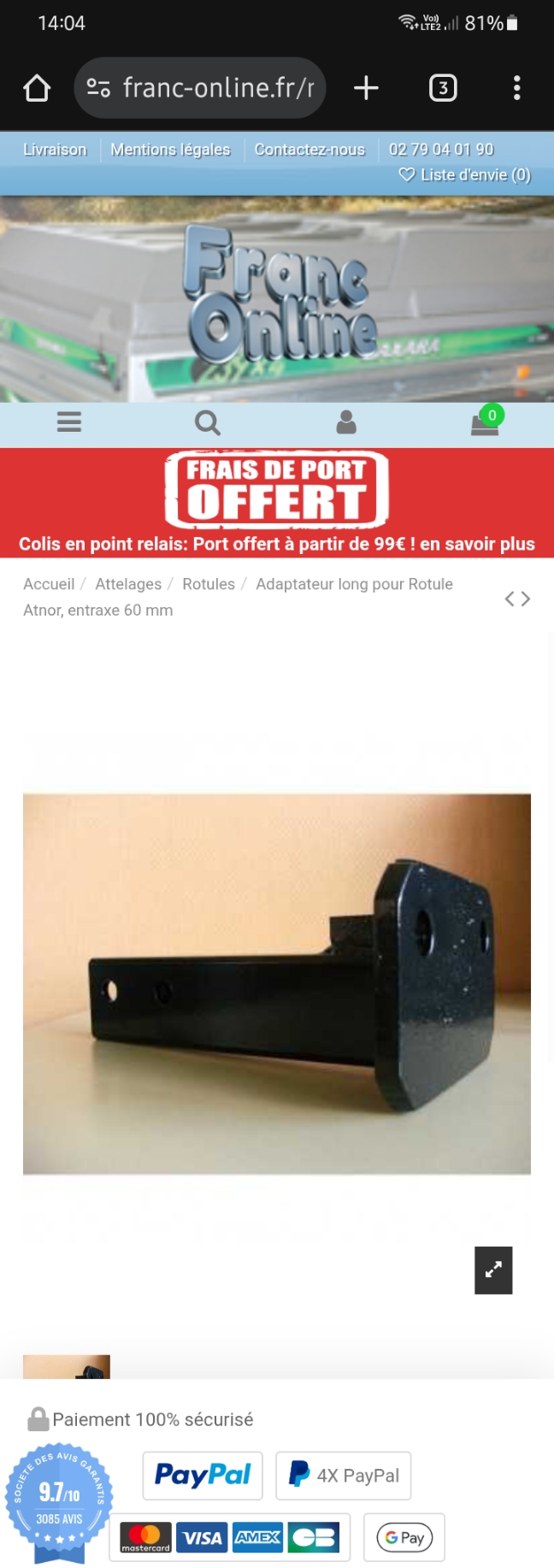 Entraxe de 60 mm pour la fixation sur l'attelage et d'un angle de 105⁰.