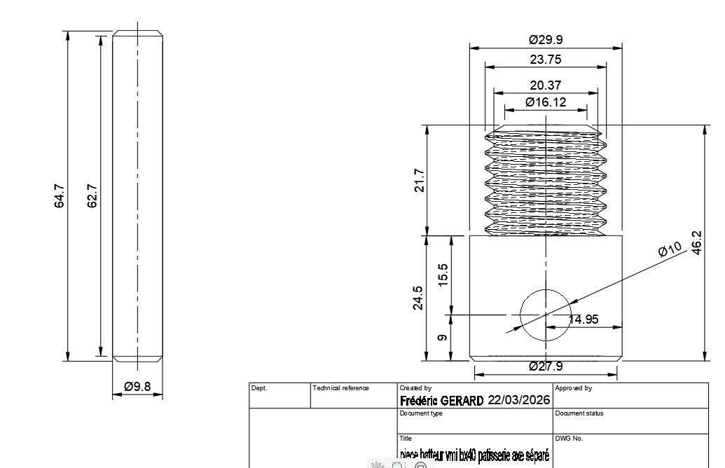 Bonjour , le plan 2d est déposé. peut être qu'il manque des précisions, à vous de me dire, je joint aussi le détail du filetage créé avec fusion360 pour plus de précision. Pour l'axe qui doit rentrer forcé dans la pièce principale, je sais pas vraiment le diamètre qu'il doit avoir :
