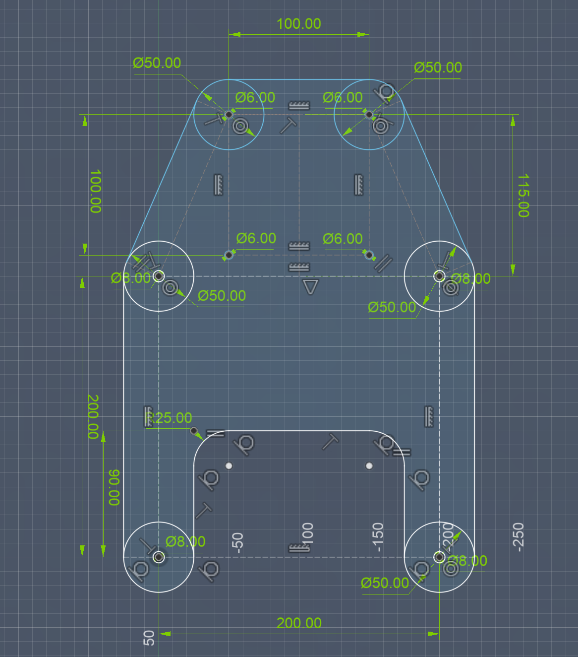 Sur la face A de la pièce les 4 trous ø8 devront être fraisés pour des vis M8 et sur la face B les trous ø6 devront l'être pour des vis m6 afin qu'elles ne dépassent pas.