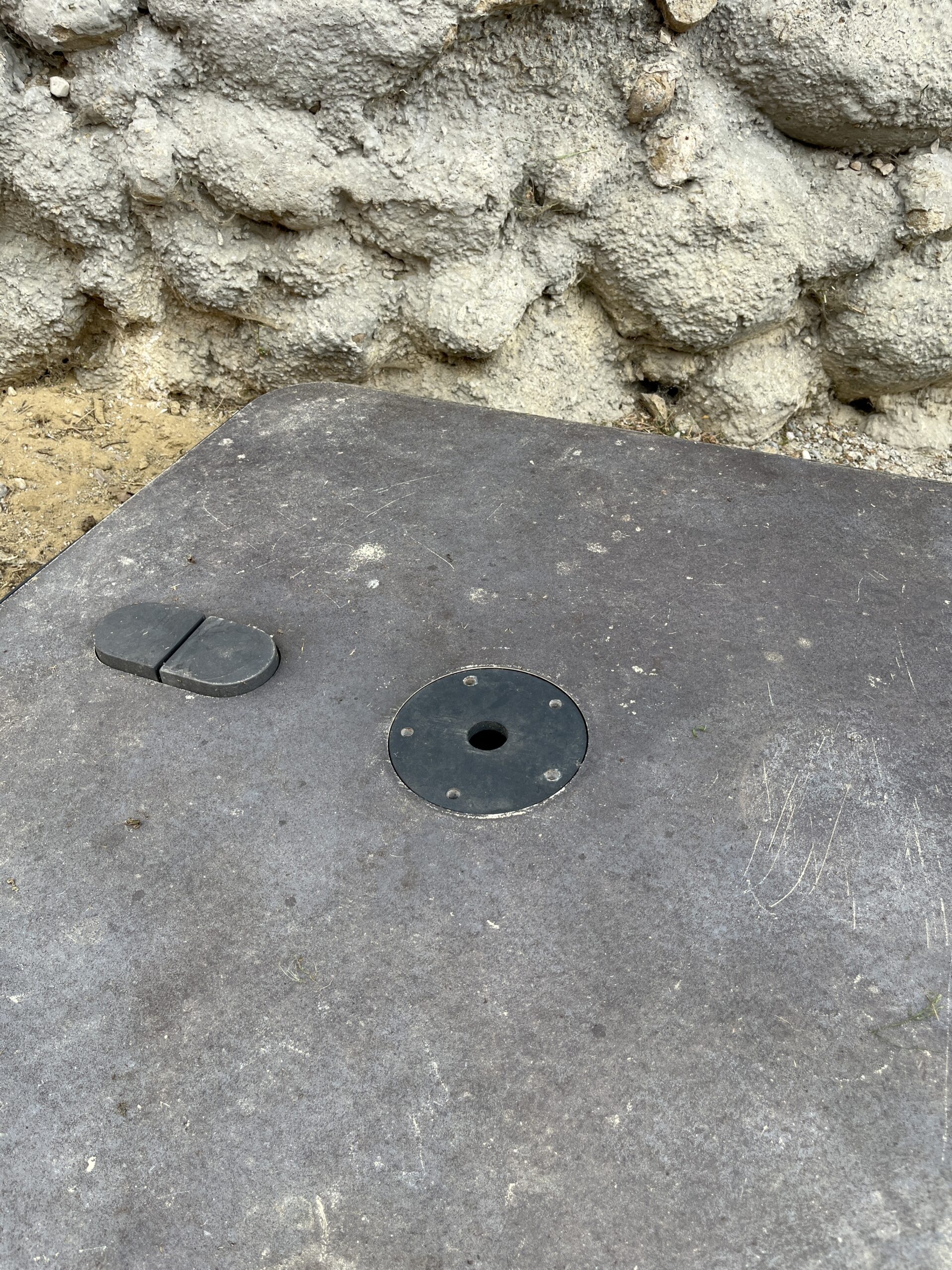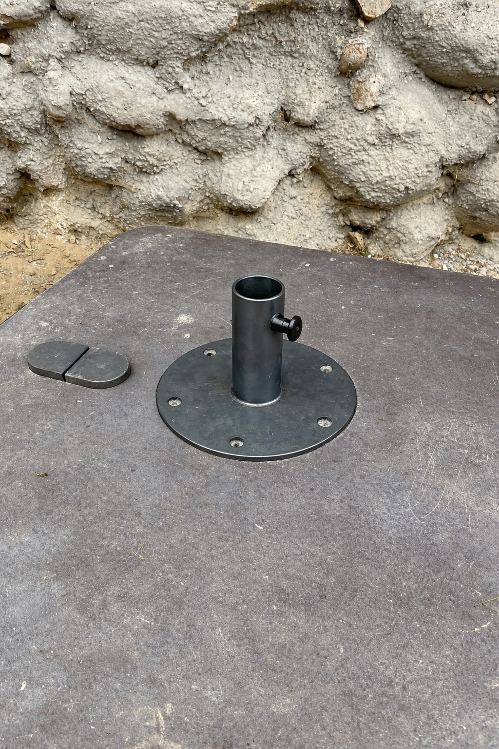 J’ai un pied de parasol mais pas la platine pour faire la liaison entre les deux. Il faut une platine rond avec 5 perçages et un tube soudé au centre avec une vise au sommet pour bloquer le parasol. A vous de voir pour les ep. Y a un schéma en PJ