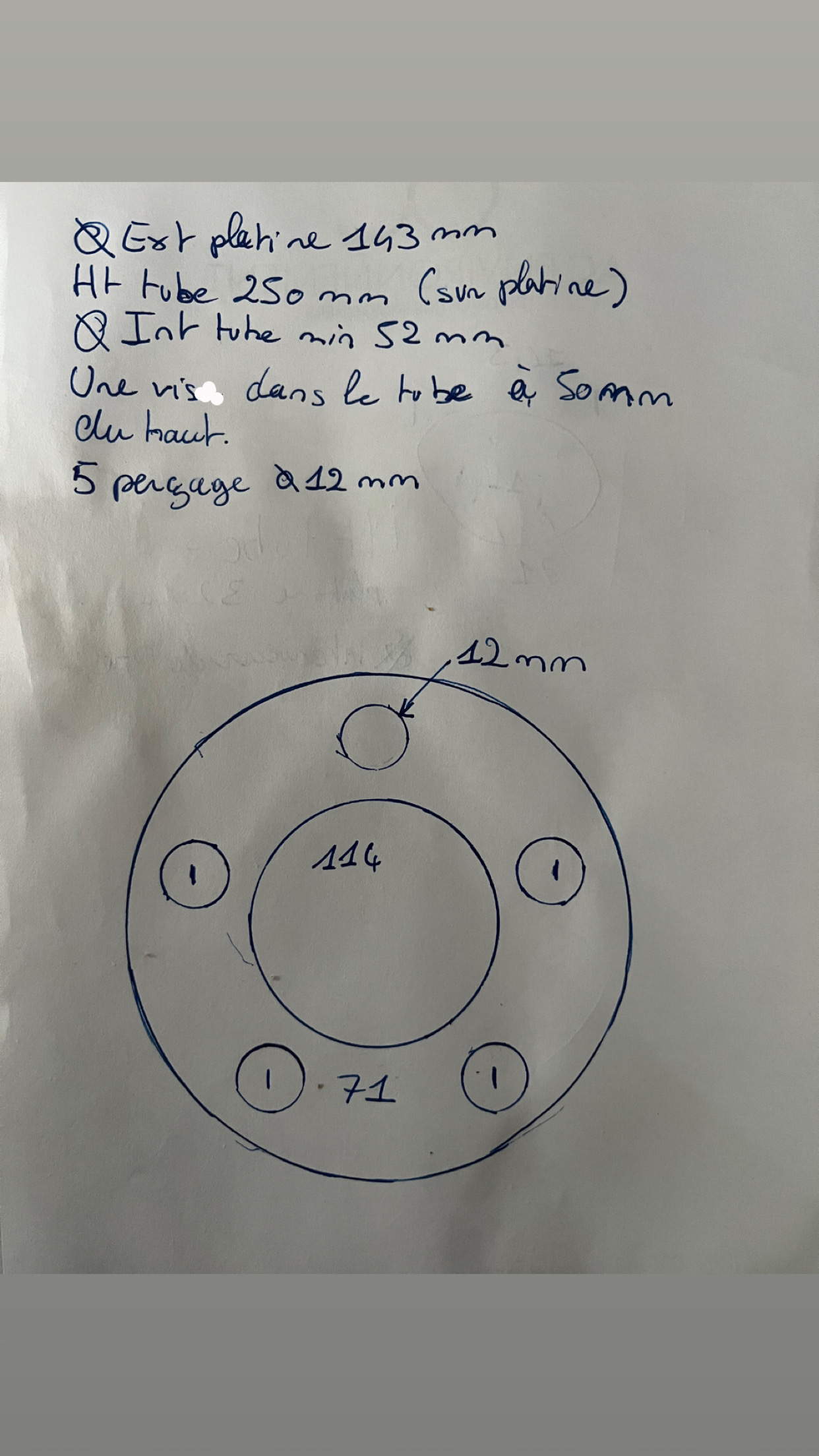C’est l’entraxe de perçage. Le tube doit faire 250mm de haut et min 52 mm de diamètre